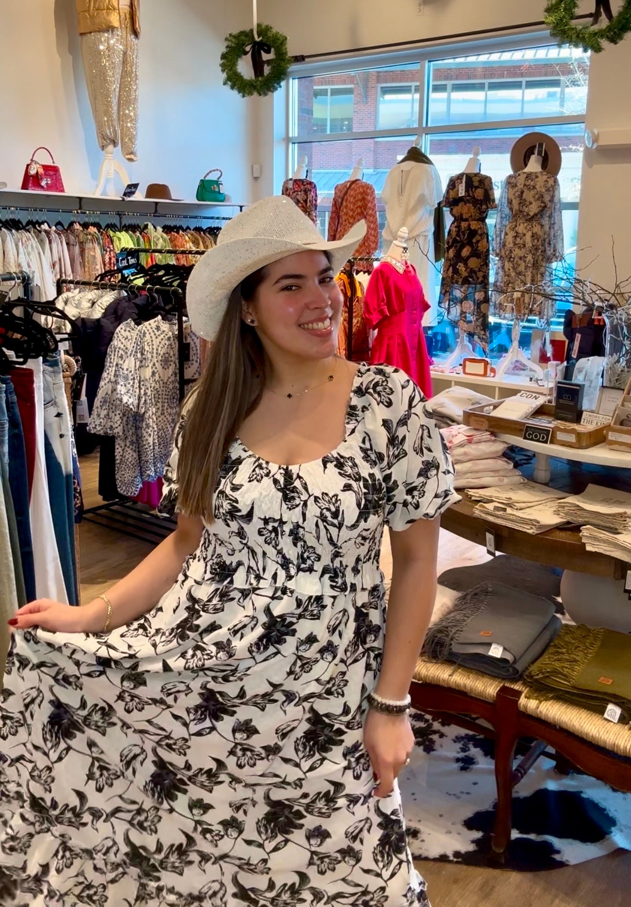 Introducing the Allis Monochrome Petals Dress - the epitome of sophistication and style. This stunning dress is perfect for any occasion, from church to a night out. With its lined and pocketed design, balloon sleeves, and striking monochromatic petal pattern, it is sure to turn heads and make a statement. Elevate your wardrobe with this versatile and elegant midi/maxi dress.